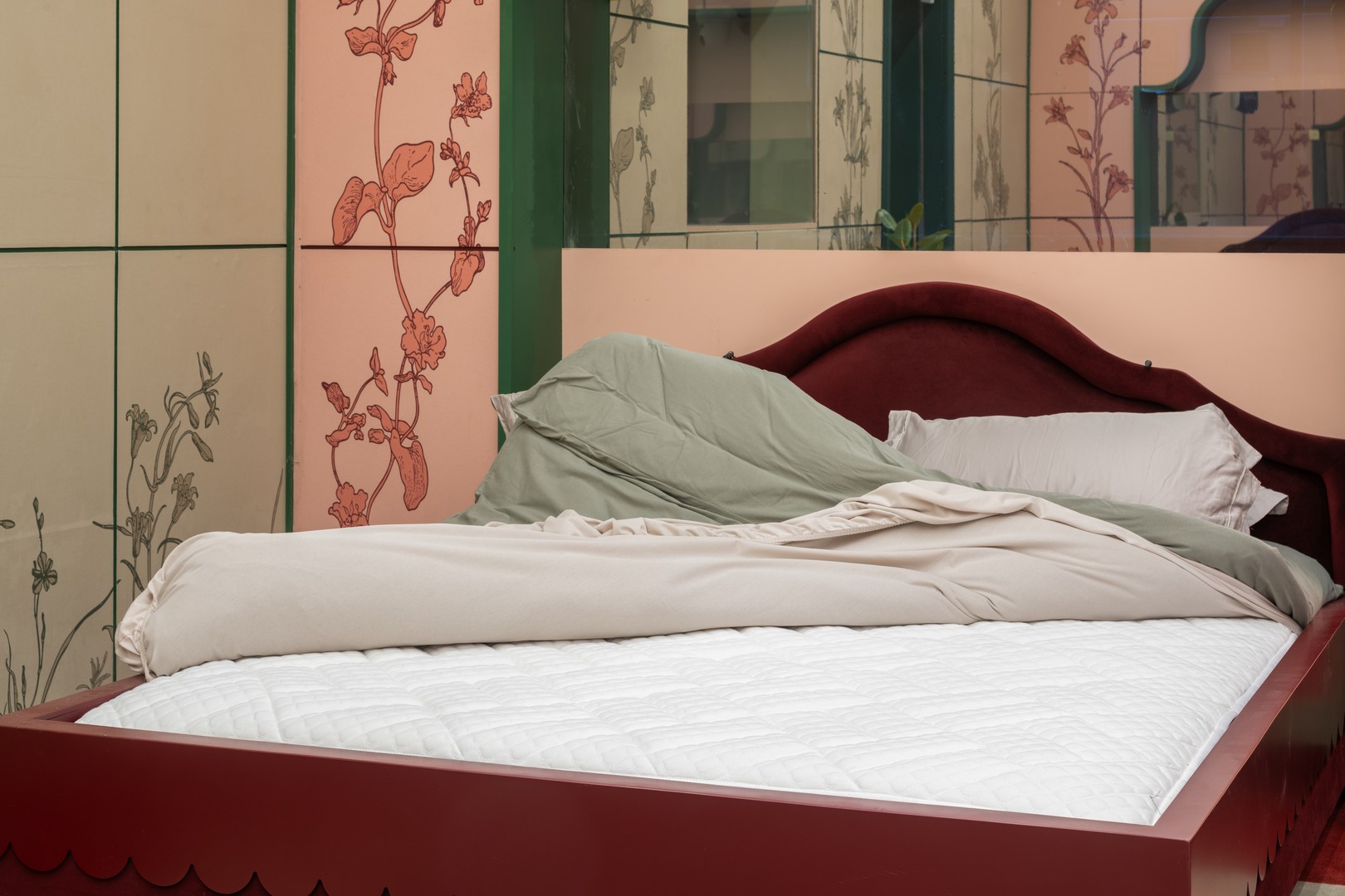 בעקבות הבחירה בצבע המיטות הסגול, מאות מטרים של בד שיובאו במיוחד מאירופה, הלבישו ועטפו את קירות הבית בעיצוב שממשיך גם על גבי המיטה דגם Passion בגודל 160/200 וחוברו לארגזי מצעים אינטגרליים בצבע ירוק – טורקיז. לכל מיטה ארגז מצעים וגב מיטה מרופד ונוח עם חריצים כל 20 ס"מ, שתוכנן במיוחד בגובה 110 ס"מ שימוקם מתחת לחלון המצלמות.