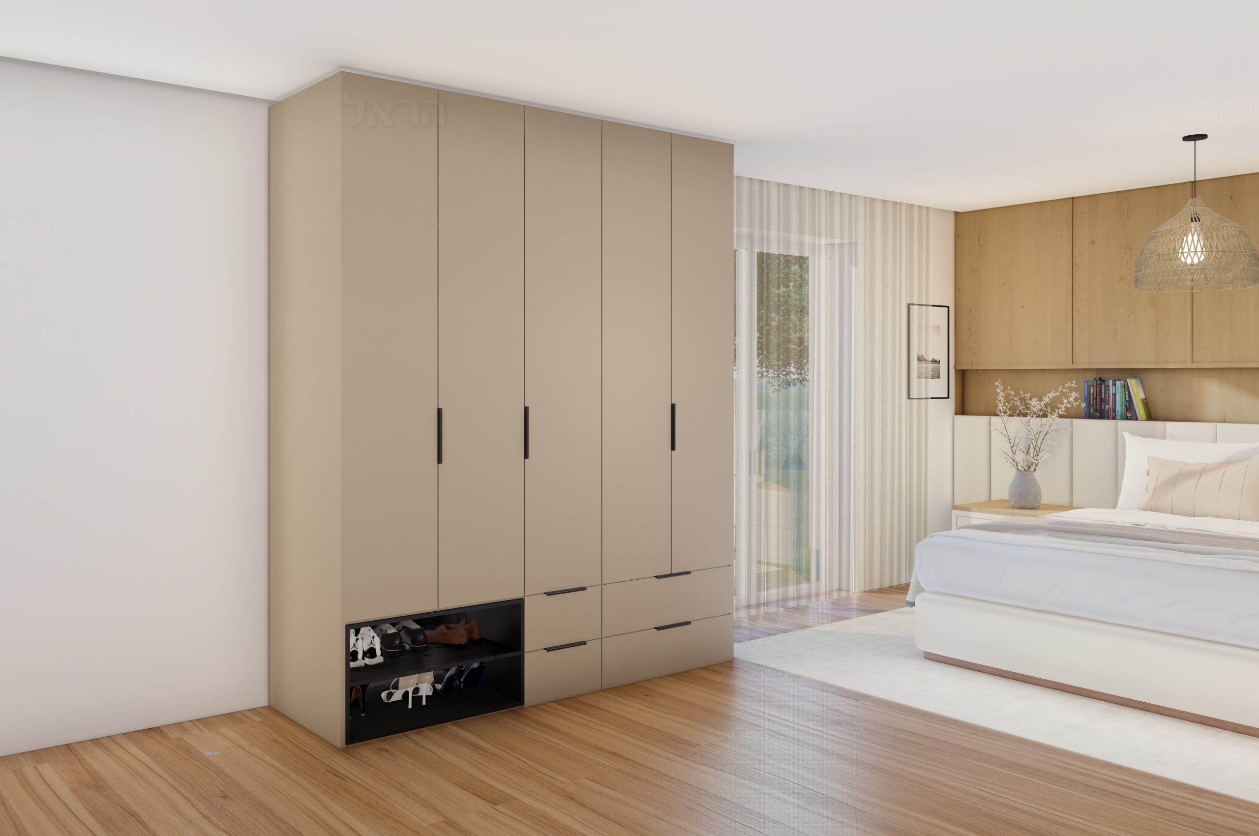ארון מרווח ופונקציונלי בשילוב מגירות חיצוניות וכוורת נעליים פתוחה – פתרון אידיאלי לבית מאורגן ויעיל.